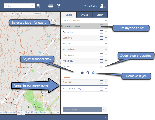 VuMap provides users with a set of predefined layers based on your subscription, these layers can include parcel information, imagery layers and various open source datasets. The controls for these layers are listed in the “Layers” widget on the right side of your VuMap interface and will allow users to: