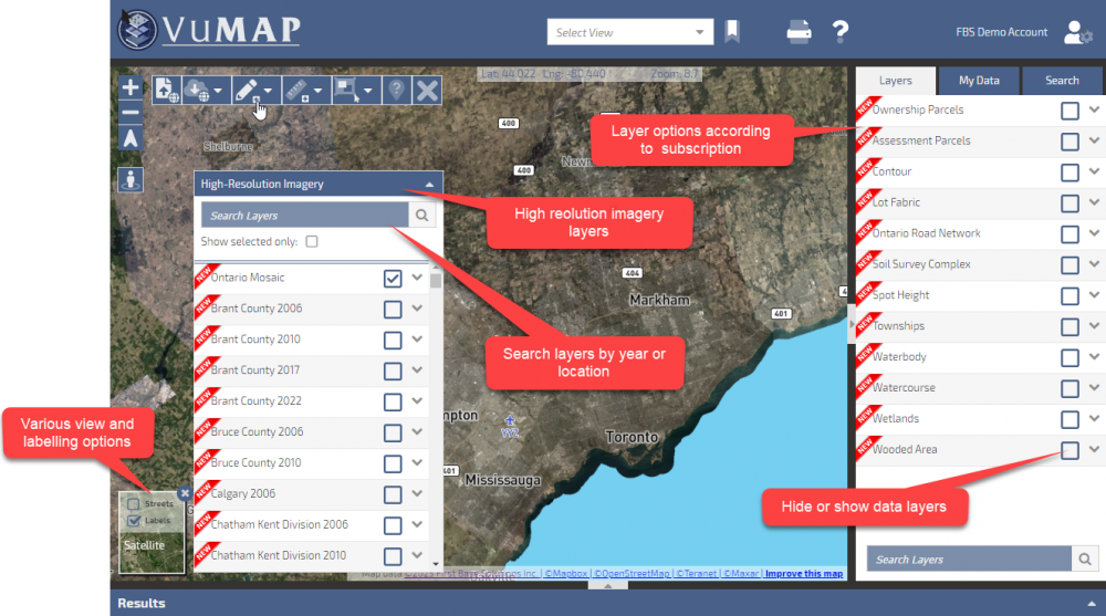 VuMap provides many options of high resolution imagery that can be searched and selected based on the viewer’s preference. These layers can be hidden or shown along with being adjusted in opacity according to the user’s individual specifications. Further information can also be viewed as VuMap provides a description on the specific layers.